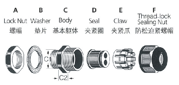 產(chǎn)品材質(zhì):A.C.E.F部分采用特殊UL認可之尼龍PA66制成(防火等級UL94V-2),B及D部分采用標準EPDM戶外耐候橡膠。(其他用途橡膠可接受定制)